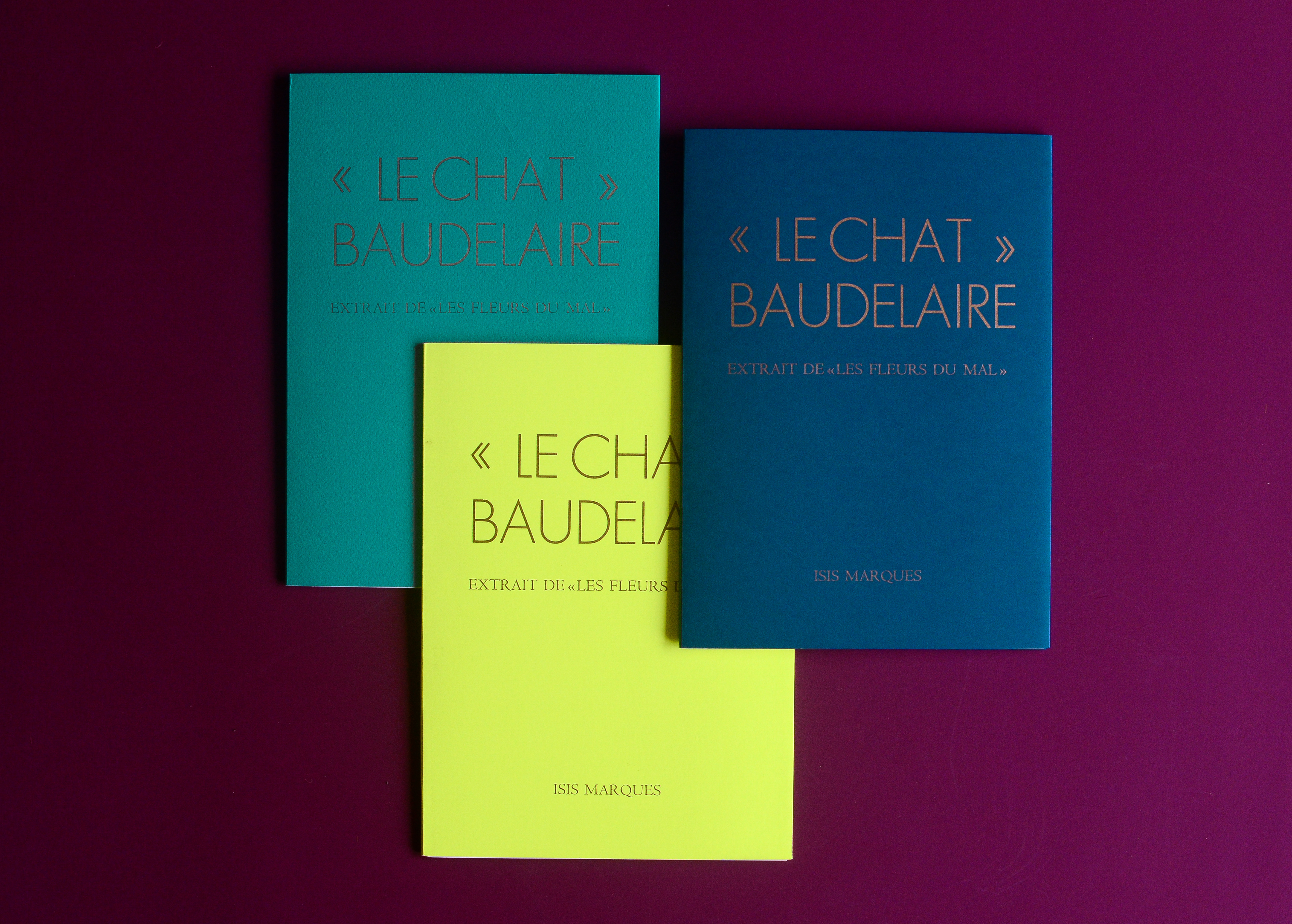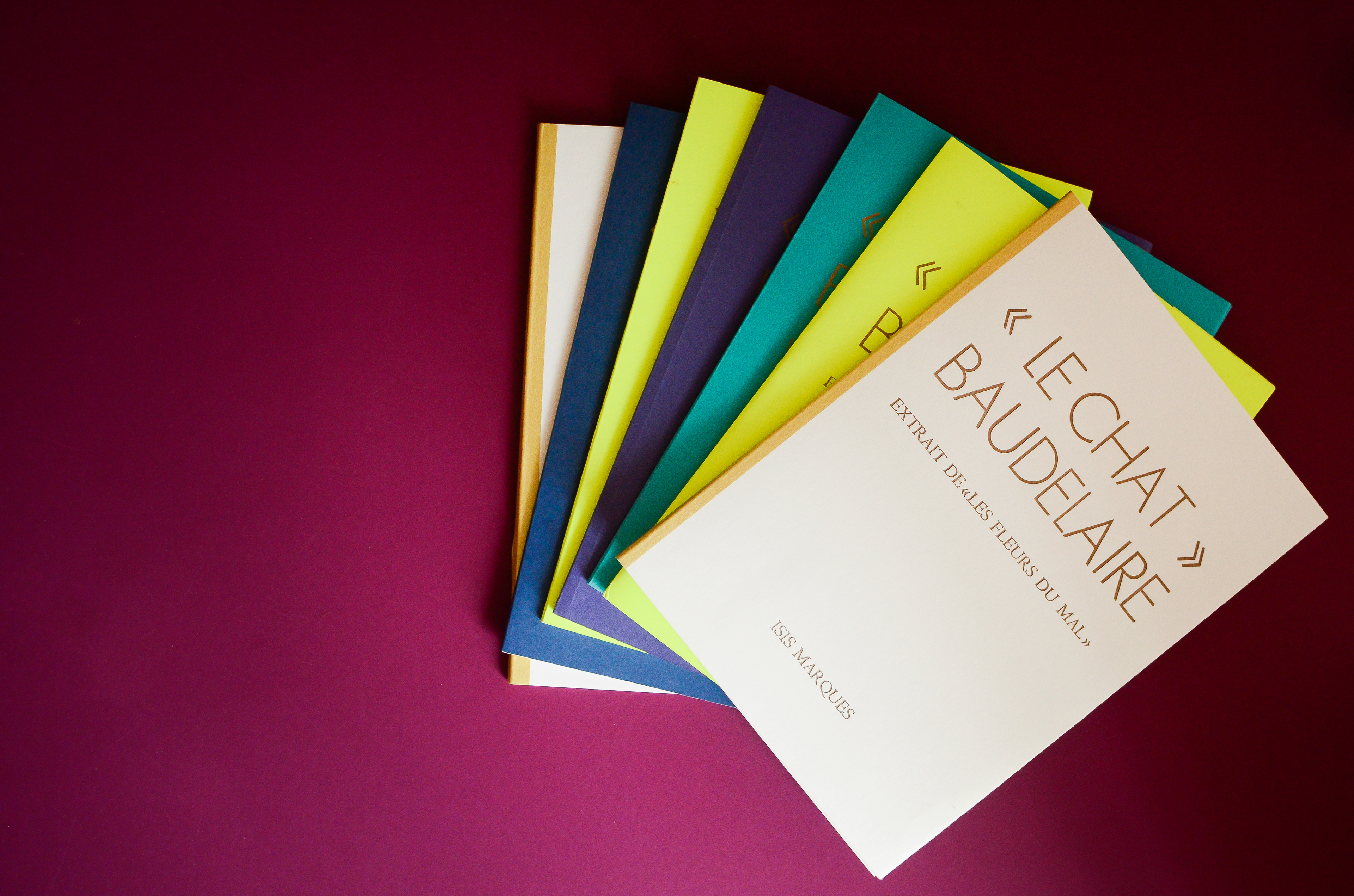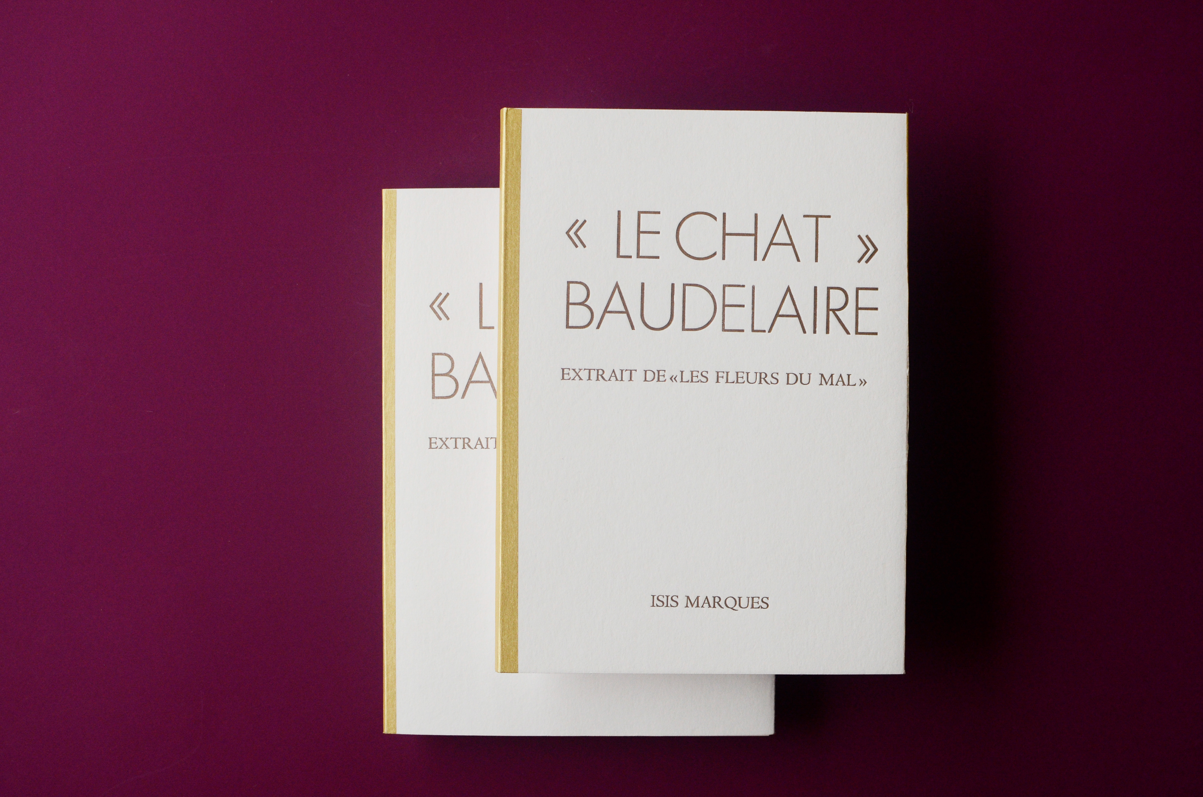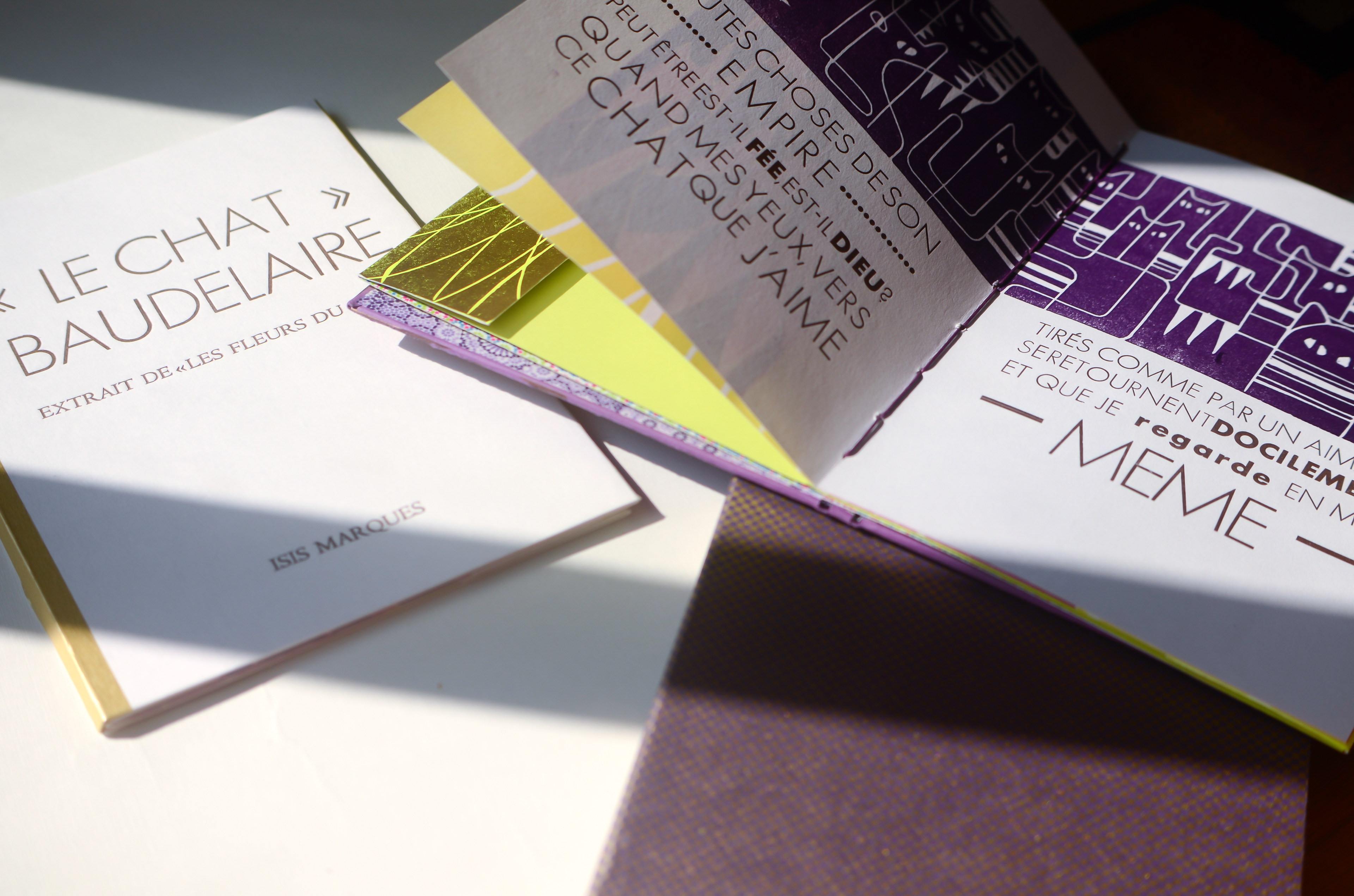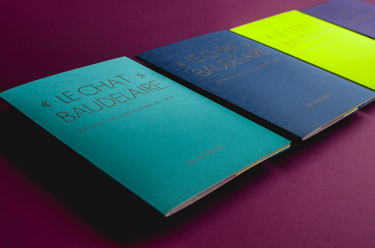Each student creates a unique and entirely handmade book. My chosen one was "The Cat" (Le Chat) published in 1857 by the poet Charles Baudelaire. Originally part of the book "Les Fleurs du Mal" (The Flowers of Evil) this poem was the first I read in French. I was 12 years old and found it in the library. I was intrigued by the title and translated it word-by-word using a dictionary. Hard were those days without google translate.