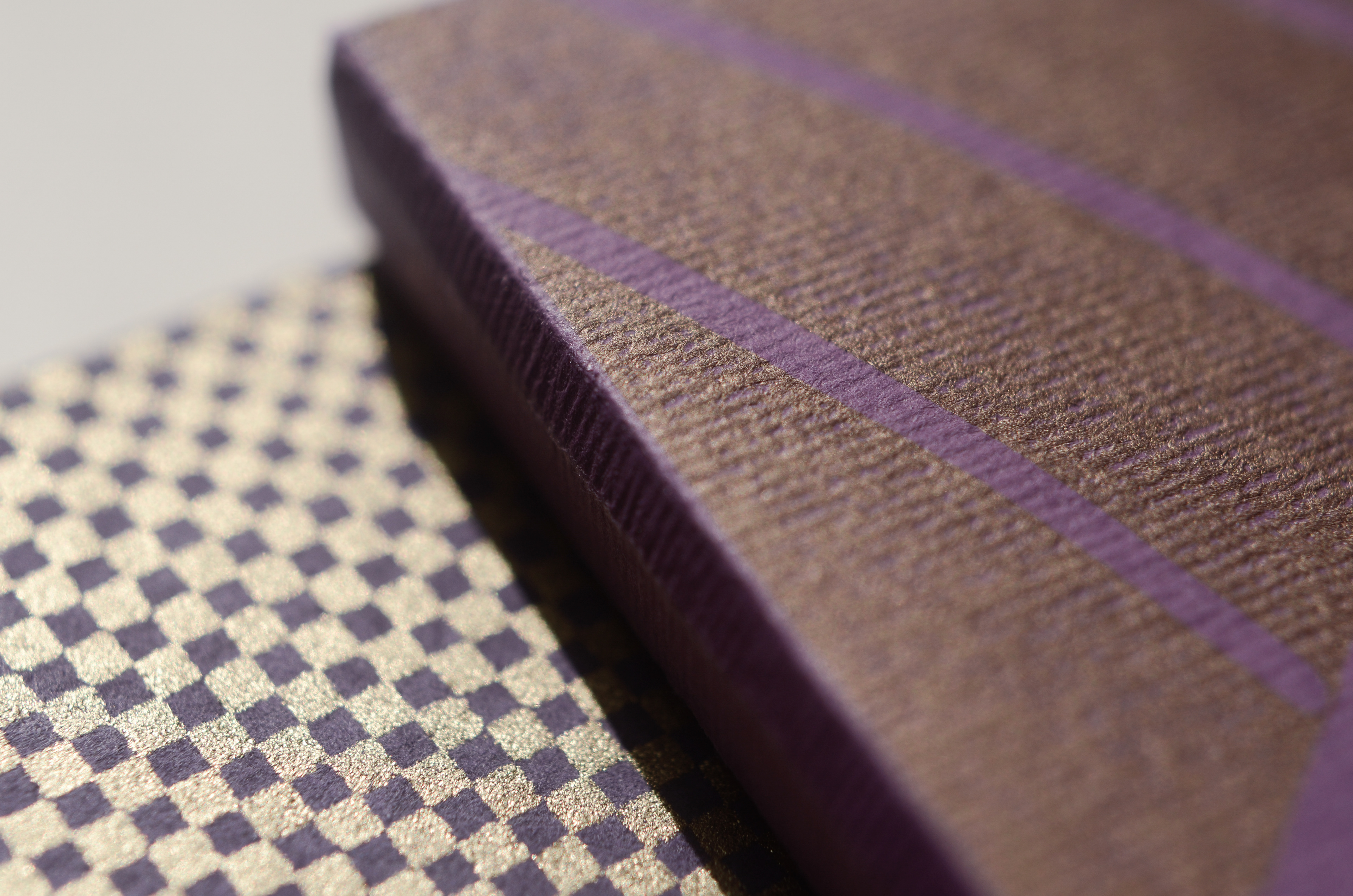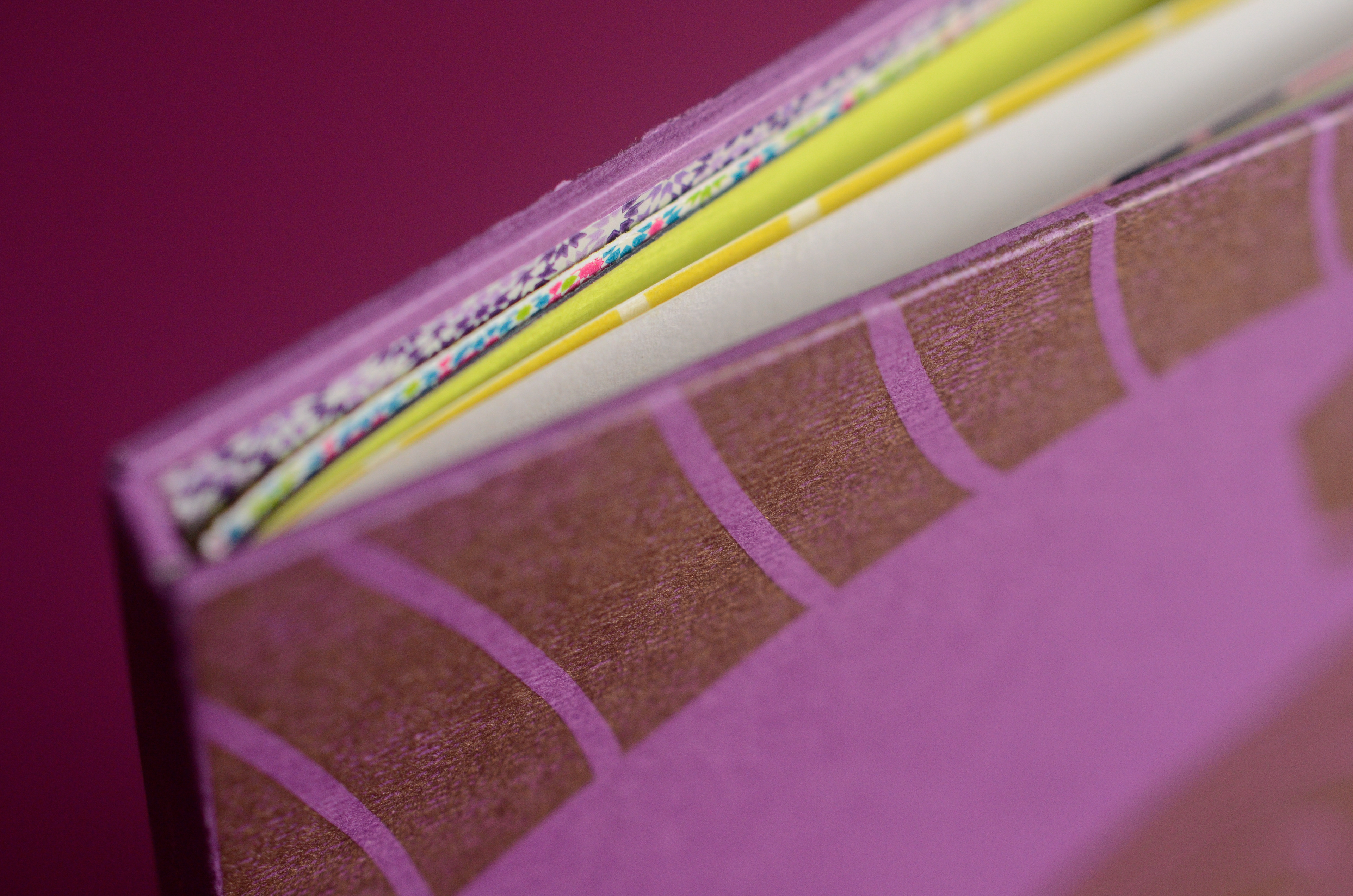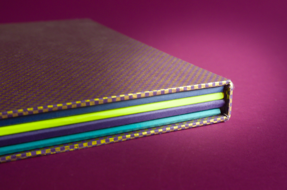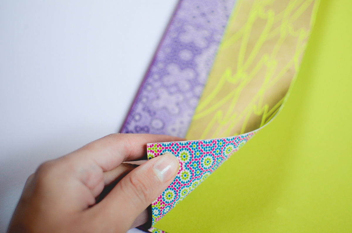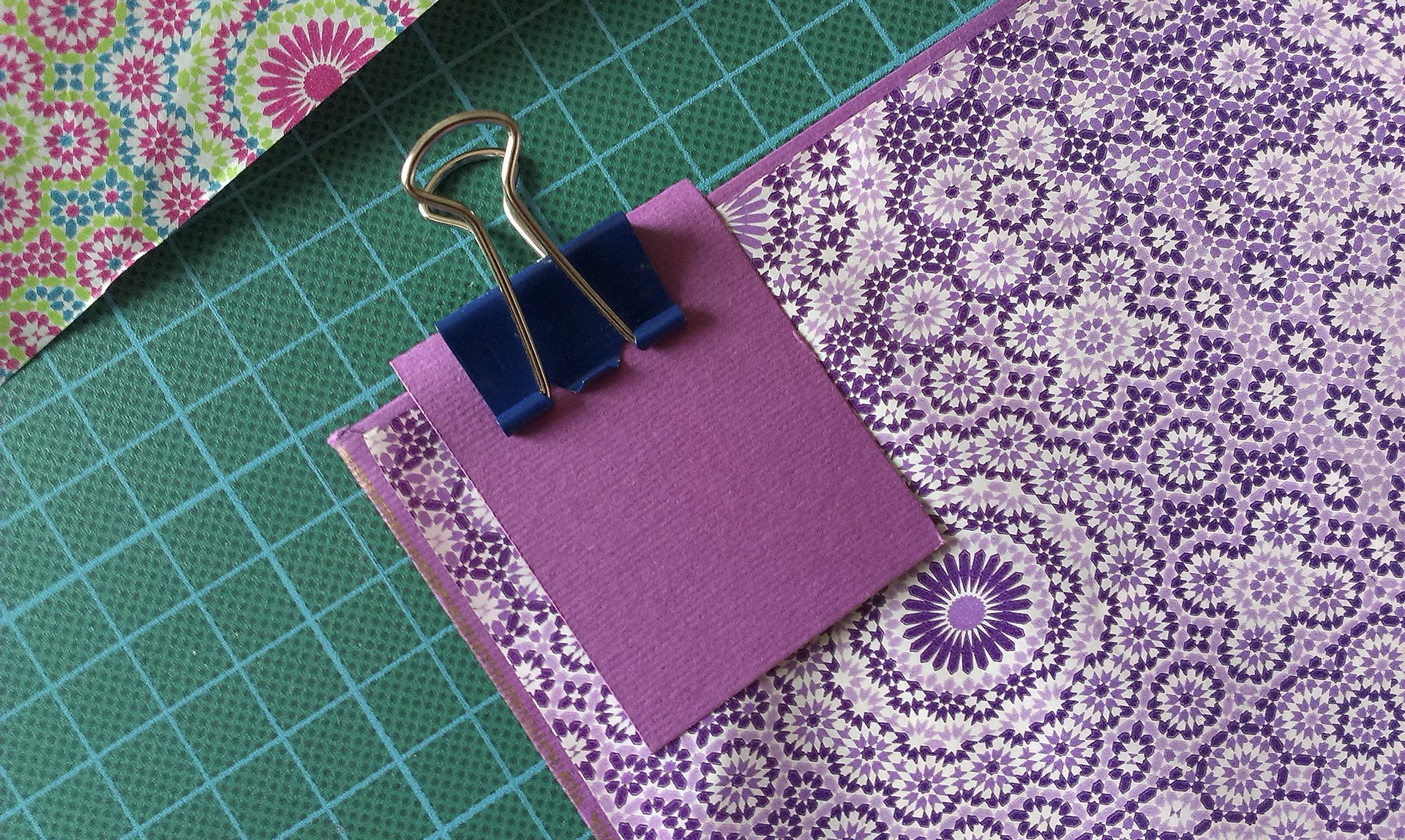The ancient-gold color was composed using a mix of magenta + gold. The purples are composed of magenta and deep blue. All the papers were found with love a little here and there in parisian paper stores: Rougier&Plé (yellow,purple and blue), Le Géant des Beaux Arts (turquoise, cardboards) et L'Art du Papier (checkered pattern).
